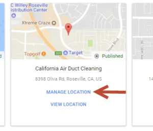 Look for the link reading “Manage Location” that shows up in the square tile listing for your business, and click that.