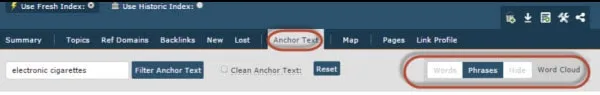 After entering a domain and running a report, just navigate to the anchor text tab, and look in the top right to enable wordcloud, choosing either phrases or words.