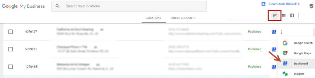 To access it, log into Google My Business and go to the dashboard of your business, by clicking the tile that says “Manage Location” under your business name. If you don’t see that, then you’re in “List View” so just click the three Dots to get to the dashboard.